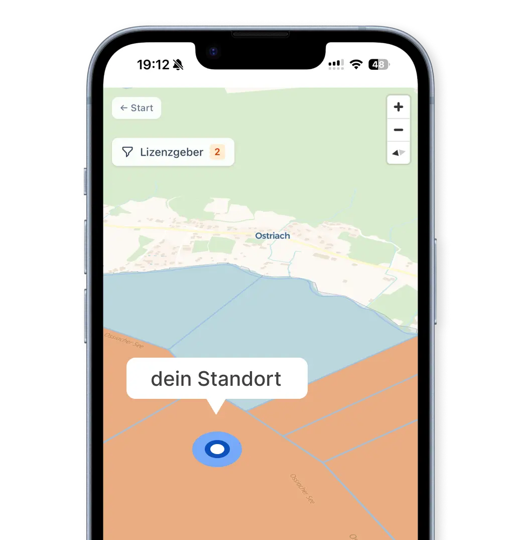 Wähle deinen Lizenzgeber – und sieh sofort alle zugehörigen Reviere auf der Karte. Egal ob vom Boot, am Ufer oder unterwegs: du hast deine Gewässer immer im Blick.